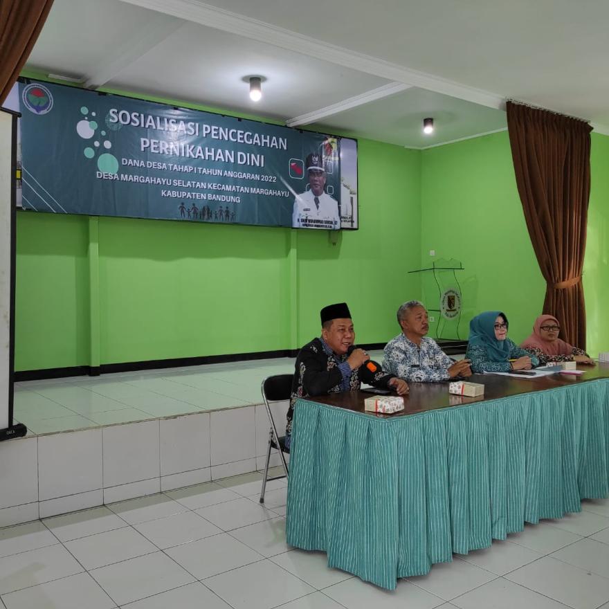 Giat Sosialisasi Pencegahan Pernikahan Dini Dana Desa Margahayu Selatan Tahap I Tahun Anggaran 2022 dilaksanakan di Aula Kantor Desa Margahayu Selatan hari Kamis, 18 Agustus 2022. Narasumber kegiatan ini adalah Ibu Diah Wulanriati, S. Psi dari Dinas Pengendalian Penduduk, Pemberdayaan Perempuan dan Perlindungan Anak (DP2KBP3A) Kabupaten Bandung. Giat ini dihadiri oleh Camat Margahayu Moh, Ischaq, S.Sos beserta Ibu D. Aidah Ishaq, Kepala Desa Margahayu Selatan H. Amin M. Barkah, ST dan perangkat desa, unsur UPTD KB, Ketua RW se-Desa Margahayu Selatan, perwakilan Kader RW, dan perwakilan Pemuda dari setiap RW. Giat Pencegahan Pernikahan Dini ini disampaikan untuk menghindari Dampak Buruk Perkawinan pada Usia anak diantaranya :