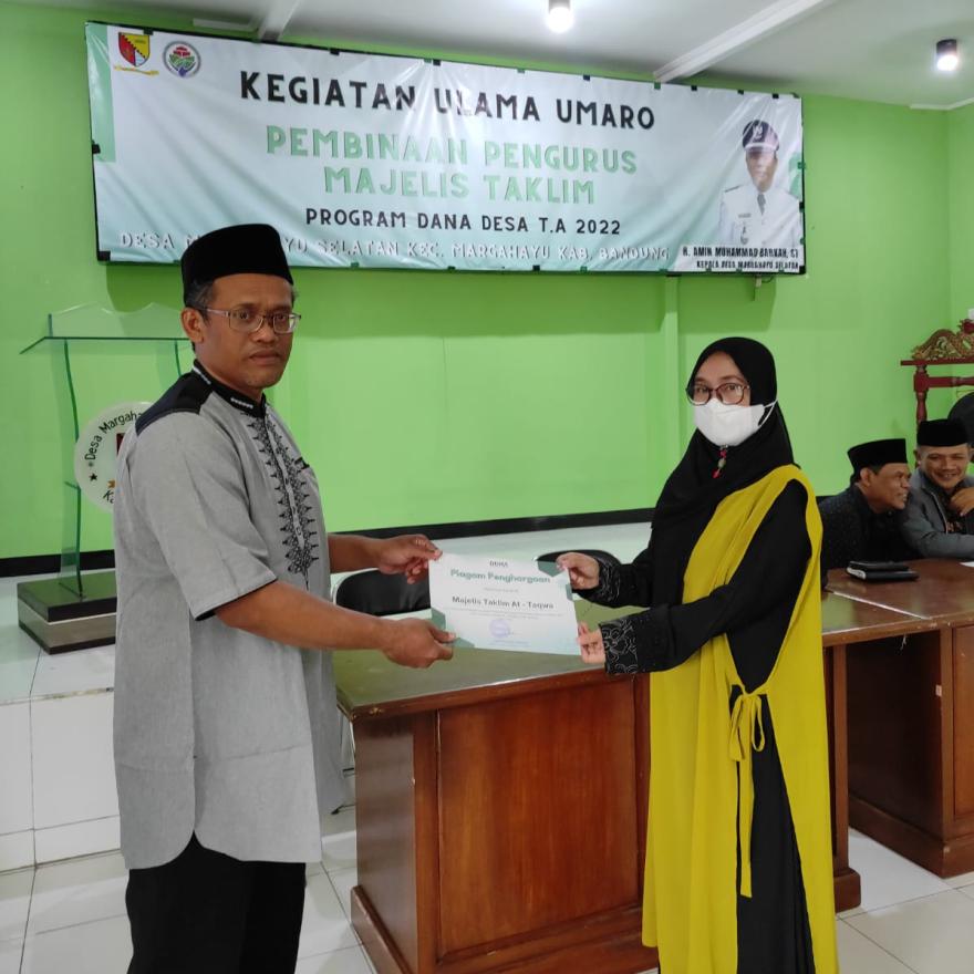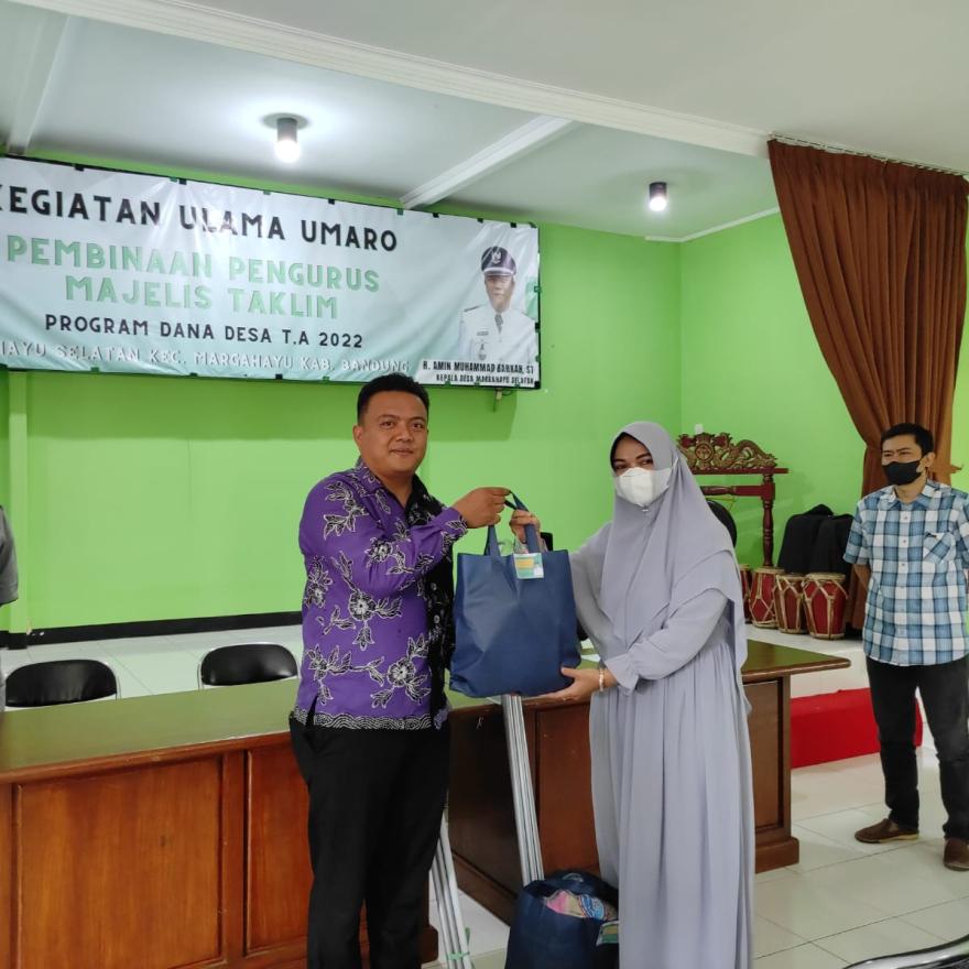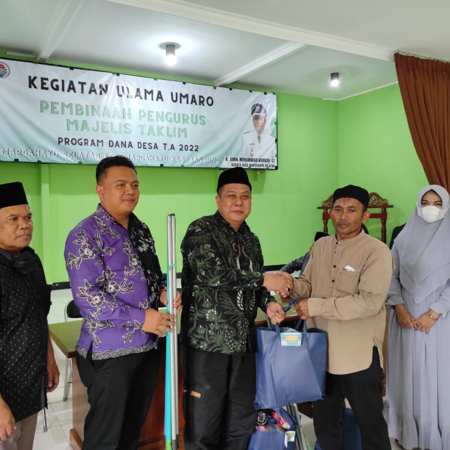 Giat Ulama Umaro Program Dana Desa Tahun Anggaran 2022 Desa Margahayu Selatan Kecamatan Margahayu Kabupaten Bandung dilaksanakan pada hari Kamis, 29 Desember 2022. Giat yang dilaksanakan di Aula Kantor Desa Margahayu Selatan ini dihadiri oleh unsur DKM dari Mesjid di Wilayah Desa Margahayu Selatan. Juga dihadiri oleh Kepala Desa Margahayu Selatan H. Amin Muhammad Barkah, ST dan perangkat desa, perwakilan Tokoh Agama Desa Margahayu Selatan, Pendamping Desa, unsur BPD Margahayu Selatan, unsur LPM Desa Margahayu Selatan dan Bhabinkamtibmas Desa Margahayu Selatan. Narasumber dari giat ini yaitu H. Agus Mursyid., M. Pdi yang memaparkan materi mengenai Pembinaan Pengurus Majelis Tak'lim. Tentunya materi ini sangat bermanfaat untuk para perwakilan pengurus DKM di wilayah Desa Margahayu Selatan. Dalam giat ini juga sekaligus dilaksanakan pemberian Alat Kebersihan untuk lingkungan mesjid di wilayah Desa Margahayu Selatan. Semoga Kegiatan ini dapat memberikan manfaat bagi Warga Desa Margahayu Selatan.