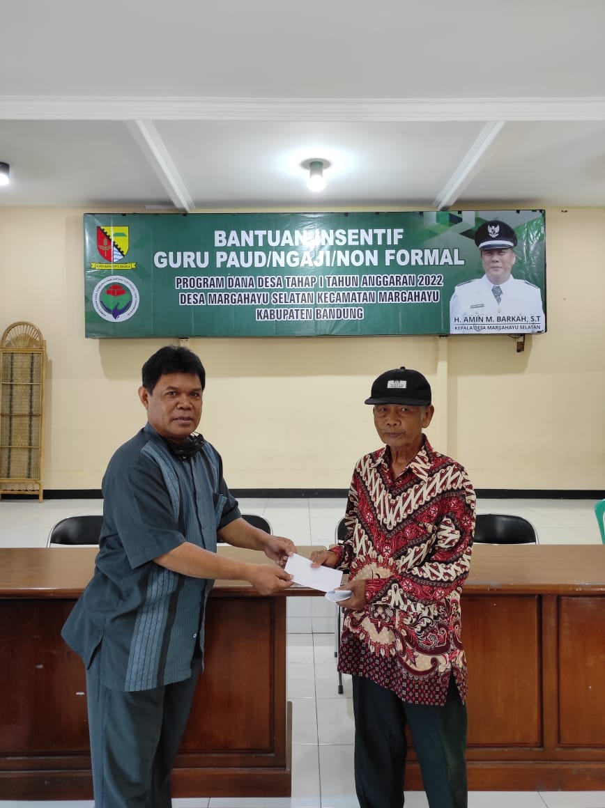 Giat Penyaluran Bantuan Insentif Guru Paud/Ngaji/Non Formal Desa Margahayu Selatan dilaksanakan pada hari Jum'at, 27 Mei 2022 di Aula Kantor Desa Margahayu Selatan. Giat Bantuan Insentif ini berasal dari Program Dana Desa Tahap I Tahun Anggaran 2022 Desa Margahayu Selatan Kecamatan Margahayu. Turut serta dalam kegiatan ini Ketua BPD Desa Margahayu Selatan, Ketua LPM Desa Margahayu Selatan, unsur Kecamatan Margahayu, Tim Pendamping Desa Margahayu Selatan dan Kepala Desa Margahayu Selatan H. Amin Muhammad Barkah, ST serta Pemerintah Desa Margahayu Selatan. Bantuan Insentif ini disalurkan kepada Guru PAUD/Guru Ngaji/Non Formal yang belum pernah mendapatkan bantuan dari sumber manapun. Penyaluran ini tetap dilaksanakan dengan mematuhi protokol kesehatan di masa Pandemi Covid-19 ini. Semoga Bantuan Insentif untuk Guru Paud/Ngaji/Non Formal ini dapat memberikan manfaat bagi penerimanya.